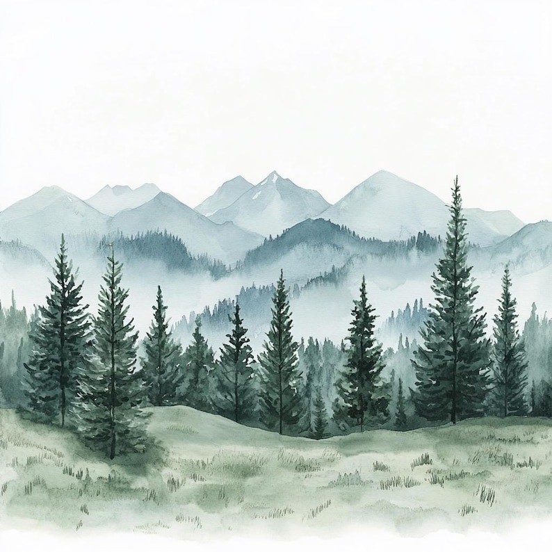 Watercolor Mountain Forest Clipart, Green Pine Trees Landscape Illustration PNG