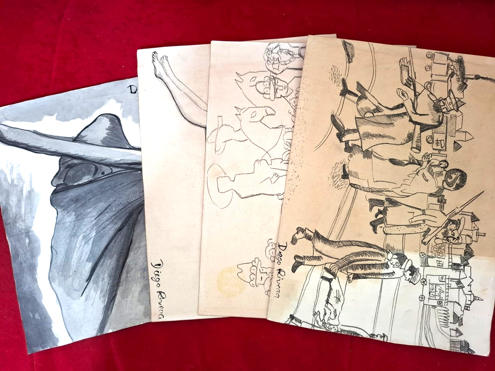 DIEGO RIVERA lot of 4 drawing on old paper signed stamped